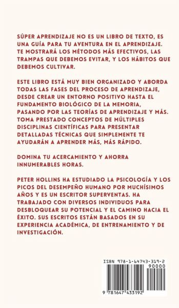 Haz que el aprendizaje sea: sencillo, emocionante, habitual y automotivador. ¡Absorbe información como una esponja humana! Nunca se nos ha enseñado cómo aprender y eso es una pena. Este libro es a clave para revertir todas las ideas equivocada que tienes y hacer que el aprendizaje sea divertido otra vez. Métodos paso a paso científicamente comprobados para el aprendizaje efectivo. Súper Aprendizaje no es un libro de texto, es una guía para tu aventura en el aprendizaje. Te mostrará los métodos más efectivos, las trampas que debemos evitar, y los hábitos que debemos cultivar. Este libro está muy bien organizado y aborda todas las fases del proceso de aprendizaje, desde crear un entorno positivo hasta el fundamento biológico de la memoria, pasando por las teorías de aprendizaje y más. Toma prestado conceptos de múltiples disciplinas científicas para presentar detalladas técnicas que simplemente te ayudarán a aprender más, más rápido. Domina tu acercamiento y ahorra innumerables horas. Peter Hollins ha estudiado la psicología y los picos del desempeño humano por muchísimos años y es un escritor superventas. Ha trabajado con diversos individuos para desbloquear su potencial y el camino hacia el éxito. Sus escritos están basados en su experiencia académica, de entrenamiento y de investigación. Maneras más inteligentes, más rápidas y mejores para alcanzar el dominio. ¿ Las precondiciones físicas y psicológicas para el aprendizaje efectivo. ¿ Cómo funciona nuestra memoria y cómo hacer que funcione para ti. ¿ Las técnicas de aprendizaje que funcionan. Con evidencia. ¿ Evita el estudio desorganizado. ¿ Por qué a Einstein le encantaba tocar el violín mientras trabajaba. ¿ Los errores de aprendizaje que probablemente estés cometiendo ahora mismo. Supera a los demás, gánale a la competencia y llega a dónde quieres llegar en tiempo récord.