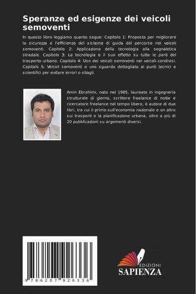 In questo libro leggiamo quanto segue: Capitolo 1: Proposta per migliorare la sicurezza e l'efficienza del sistema di guida del percorso nei veicoli semoventi. Capitolo 2: Applicazione della tecnologia alla segnaletica stradale. Capitolo 3: La tecnologia e il suo effetto su tutte le parti del trasporto urbano. Capitolo 4: Uso dei veicoli semoventi nei veicoli condivisi. Capitolo 5: Veicoli semoventi e uno sguardo dettagliato ai punti tecnici e scientifici per evitare errori o sbagli.
