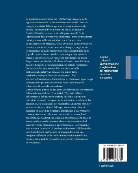Perché sperimentare e registrare i radiofarmaci?.- Normativa europea e normative nazionali sui radio farmaci.- Normativa europea e nazionale sui radiofarmaci: la sperimentazione clinica.- Classificazione dei radio farmaci.- I radiofarmaci e la farmacopea.- Sperimentazione preclinica di radio farmaci.- Sperimentazioni cliniche con radio farmaci.- Le Norme di Buona Pratica di Laboratorio.- Le Norme di Buona Pratica Clinica e le responsabilità dello sperimentatore.- La preparazione di un Investigational Medicinal Product Dossier (IMPD).- Ruolo e funzioni dei Comitati etici nelle sperimentazioni cliniche dei medicinali.- Le procedure di autorizzazione all'immissione in commercio dei medicinali per uso umano.- Usi off label dei farmaci: quali strumenti normativi?.- Percorsi formativi e figure professionali nella preparazione dei radio farmaci.