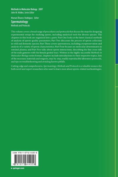 Spermatology: Current Methods to Study Sperm Classical Variables.- Evolutionary Aspects of Sperm Physiology and Its Assessment.- Assessment of Boar Semen Morphology and Morphometry.- Semen Extraction and Analysis in Domestic Animals.- Semen Extraction and Management in Wild Animals: TUMASG Technique.- Semen Extraction and Analysis in Avian Species.- Boar Semen Assessment for the Production of Artificial Insemination Doses.- Semen Evaluation in the Production of Bovine Artificial Insemination Doses.- Sperm Vitrification in Horse and Donkey.- Cryopreservation of Dog Semen.- Rabbit Sperm Cryopreservation.- Cryopreservation of Small Ruminant Sperm and Detection of Sperm Cryocapacitation.- Sperm Cyropreservation in Boars.- Cryopreservation of Horse Sperm.- New Delivery Systems on Sperm Quality Improvement.- Assessment of Sperm Motility with the Use of Computer-Aided Sperm Analysis (CASA).- Bioinformatics on Sperm Subpopulations using Computer Assisted Sperm Analysis (CASA).- Sperm Selection by Colloid Centrifugation.- Bioenergetics of Rodent Spermatozoa.- Flow Cytometry in the Assessment of Sperm Function Parameters: Viability, Acrosomal Integrity, Membrane Stability, and Mitochondrial Status.- Dextran/Swim-Up Procedure for Ram Sperm Selection.- Chromatin Structure Assessment Using Flow Cytometry after DNA Denaturation and Acridine Orange Staining.- Assessment of the Sperm DNA Oxidative Damage by Immunofluorescence and Flow Cytometry.- Sperm Intracellular Calcium Evaluation.- Oxidative Status Measurement in Domestic and Wild Small Ruminants' Species.- Evaluation of Oxidative Stress in Mammalian Spermatozoa.- Real-Time Acrosome Reaction and Intracellular Calcium Recordings in Mice Sperm.- Field Emission Scanning Electron Microscopy (FE-SEM) as an Approach for Membrane Surface Mapping in Cell Biology.- Detection of Sperm Membrane Proteins by Immunocytochemistry, Scanning and Transmission Electron Microscopy, and Western Blotting.- Detection and Quantification of mRNA in Mammalian Spermatozoa.- Techniques to Determine Mammalian Sperm Capacitation.- Disulfide Bridges Assessment in the Sperm Chromatin by Flow Cytometry.- Analysis of the Chromatin Structure by Chromomycin A3 (CMA3) and Flow Cytometry.- Isolation of High-Quality RNA from Mammalian Spermatozoa for Transcriptome Studies.- Prediction of CircRNAs in Mammalian Spermatozoa from RNA Sequencing Data.- Reduced Representation Bisulfite Sequencing Library Preparation for Sperm DNA Methylation Analyses: Manuel and Automated Methods.- Production of Healthy Mice from Freeze-Dried Spermatozoa Preserved at Room Temperature.- High Throughput Analysis of Post-Meiotic Male Germ Cells Using Image Flow Cytometry.- Assessment of Bacterial Contamination in Semen.- A Size-Exclusion Chromatography-Based Procedure for Isolating Extracellular Vesicle Subsets from Porcine Semina Plasma.- Molecular Determinants in Pig Semen: Verified Protocols for Cytokine Detection and Quantification.- Molecular Determinants in Semina Plasma and Spermatozoa: Non-Targeted Metabolomics.- Seminal Plasma Proteomics using Filter Aided Sample Preparation.- Assessing Seminal Fluid Interaction with Female Reproductive Tract Tissues: In Vivo and In Vitro Models for Mouse.- Seminal Fluid Interaction with Female Reproductive Tract Epithelial Cells: In Vitro Models for Human.- Impact of Seminal Plasma on the Embryonic Development and Uterine Environment in Pigs.- Assessment of Sperm Binding Capacity in the Reservoir using an In Vitro Model of Oviduct Epithelial Spheroids in Cattle.- Characterization of Ovine Cervical Mucus and Implementation of a Sperm-Mucus Penetration Test Using Fluorescently Labeled Sperm.