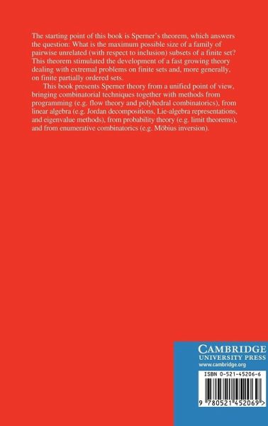 The starting point of this book is Sperner's theorem, which answers the question: What is the maximum possible size of a family of pairwise (with respect to inclusion) subsets of a finite set? This theorem stimulated the development of a fast growing theory dealing with external problems on finite sets and, more generally, on finite partially ordered sets. This book presents Sperner theory from a unified point of view, bringing combinatorial techniques together with methods from programming, linear algebra, Lie-algebra representations and eigenvalue methods, probability theory, and enumerative combinatorics. Researchers and graduate students in discrete mathematics, optimisation, algebra, probability theory, number theory, and geometry will find many powerful new methods arising from Sperner theory.