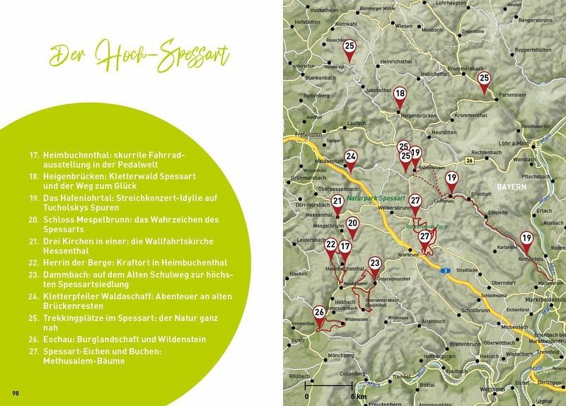 Der Spessart mit dem größten Laubmischwaldgebiet Deutschlands bietet mehr als nur den weiten Blätterozean mit seinen Methusalem-Bäumen und dem Farbenspiel von zart-leuchtend grün im Frühling bis feuerrot und sattgelb im Herbst. Da sind die Weinberge, die bisweilen spektakulär in Terrassen zum Main hinabstürzen und die Trauben mithilfe der Sonne und dem Herzblut der Winzer zu ausgesprochen edlen Tropfen werden lassen. Da sind die hoch über dem Main thronenden, jahrhundertealten Ruinen, die Geschichten aus vergangenen Zeiten erzählen. Der Geschichte nachspüren kann man auch in den berühmten Schlossbauten wie in Mespelbrunn und Aschaffenburg oder bei einem Spaziergang durch die pittoresken Fachwerkstädtchen am Main. Nicht zuletzt ist der Spessart ein Wanderland, durchzogen von verwunschenen Pfaden und versteckten Wiesentälern mit mäandernden Bächen...Kunstwerke und Museen auf Weltniveau, urige Wirtshäuser mitten im Wald, eine fränkische Rotweinkultur, die ihresgleichen sucht, ursprüngliche Naturerlebnisse und Wandertipps: Dieses Buch lädt ein, 50 Schätze in der Kulturlandschaft des Spessart zu heben - jeder Fund ein kleiner Glücksmoment.