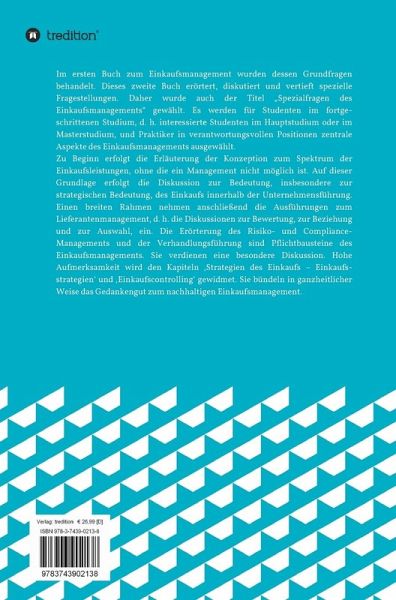 Im ersten Buch zum Einkaufsmanagement wurden dessen Grundfragen behandelt. Dieses zweite Buch erörtert, diskutiert und vertieft spezielle Fragestellungen. Daher wurde auch der Titel "Spezialfragen des Einkaufsmanagements" gewählt. Es werden für Studenten im fortgeschrittenen Studium, d. h. interessierte Studenten im Hauptstudium oder im Masterstudium, und Praktiker in verantwortungsvollen Positionen zentrale Aspekte des Einkaufsmanagements ausgewählt.Zu Beginn erfolgt die Erläuterung der Konzeption zum Spektrum der Einkaufsleistungen, ohne die ein Management nicht möglich ist. Auf dieser Grundlage erfolgt die Diskussion zur Bedeutung, insbesondere zur strategischen Bedeutung, des Einkaufs innerhalb der Unternehmensführung. Einen breiten Rahmen nehmen anschließend die Ausführungen zum Lieferantenmanagement, d. h. die Diskussionen zur Bewertung, zur Beziehung und zur Auswahl, ein. Die Erörterung des Risiko- und Compliance-Managements und der Verhandlungsführung sind Pflichtbausteine des Einkaufsmanagements. Sie verdienen eine besondere Diskussion. Hohe Aufmerksamkeit wird den Kapiteln 'Strategien des Einkaufs - Einkaufsstrategien' und 'Einkaufscontrolling' gewidmet. Sie bündeln in ganzheitlicher Weise das Gedankengut zum nachhaltigen Einkaufsmanagement.In den einzelnen Kapiteln werden für die interessierten Leser einführende und weitergehende Literaturhinweise gegeben.