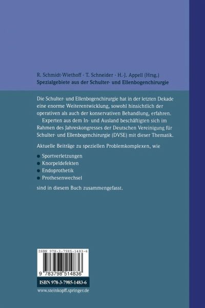 Aus dem Inhalt: Klinische und bildgebende Diagnostik Sportverletzungen an Schulter und Ellenbogen: Die intramedulläre Osteosynthese der Klavikula beim Sportler.- Knorpelschäden an Schulter und Ellenbogen: Osteochondrale autologe Transplantation an der Schulter; Autologous chondrocyte implantation on a collagen scaffold.- Prothesenwechseloperationen: Management von infizierten Schulterendoprothesen; Ellbogenprothesenwechsel - technische Möglichkeiten und Probleme.- Konzepte der Schulterchirurgie: Surface replacement arthroplasty; Die Behandlung der Humeruskopffraktur.- Rotatorenmanschetten- und Weichteildefekte: Glenohumerale Chondromalazie bei Rotatorenmanschettenruptur; The Proximal Biceps Tendon: Pathology and Fixation.- Schulterinstabilität: Unterschiedliche operative Behandlungsstrategien bei der posterioren Schulterinstabilität.- Ellenbogen: Anatomical geometry of the elbow - new aspects; Operative Treatment of Chronic Moteggia Lesion in Younger Children.