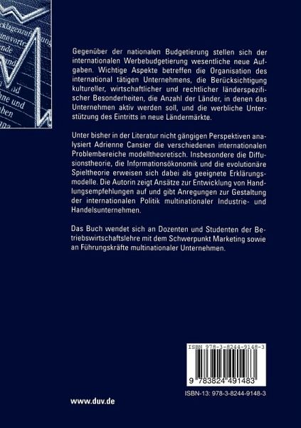 Gegenüber der nationalen Budgetierung stellen sich der internationalen Werbebudgetierung wesentliche neue Aufgaben. Wichtige Aspekte betreffen die Organisation des international tätigen Unternehmens, die Berücksichtigung kultureller, wirtschaftlicher und rechtlicher länderspezifischer Besonderheiten, die Anzahl der Länder, in denen das Unternehmen aktiv werden soll, und die werbliche Unterstützung des Eintritts in neue Ländermärkte.
