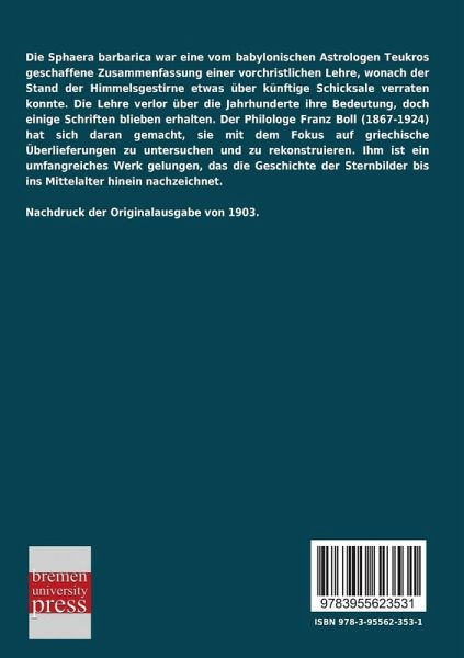Die Sphaera barbarica war eine vom babylonischen Astrologen Teukros geschaffene Zusammenfassung einer vorchristlichen Lehre, wonach der Stand der Himmelsgestirne etwas über künftige Schicksale verraten konnte. Die Lehre verlor über die Jahrhunderte ihre Bedeutung, doch einige Schriften blieben erhalten. Der Philologe Franz Boll (1867-1924) hat sich daran gemacht, sie mit dem Fokus auf griechische Überlieferungen zu untersuchen und zu rekonstruieren. Ihm ist ein umfangreiches Werk gelungen, das die Geschichte der Sternbilder bis ins Mittelalter hinein nachzeichnet.