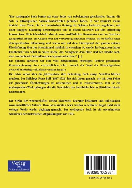 "Das vorliegende Buch beruht auf einer Reihe von unbekannten griechischen Texten, die sich in astrologischen Sammelhandschriften gefunden haben. Es war zunächst meine Absicht, diese Texte, die der literarischen Gattung der Sphaera barbarica angehören, mit einer knappen Einleitung herauszugeben und in einem Nachwort auf ihre Bedeutung hinzuweisen. Allein ich sah bald, dass sie ohne ausführlichen Kommentar zwar im Einzelnen gelegentlich nützen, im Ganzen aber nur Verwirrung anrichten könnten; sie bedurften einer durchgreifenden Erläuterung und waren nur auf dem Hintergrund der ganzen antiken Überlieferung über den Sternhimmel wirklich zu verstehen. So wurde der begonnene kurze Fundbericht von selbst zu einem Buche, das, wenigstens dem Plane und der Absicht nach, eine erschöpfende Behandlung des Gegenstandes bietet." [...]