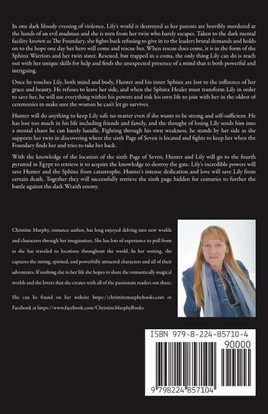In one dark bloody evening of violence, Lily's world is destroyed as her parents are horribly murdered at the hands of an evil madman and she is torn from her twin who barely escapes. Taken to the dark mental facility known as The Foundary, she fights back refusing to give in to the leaders brutal demands and holds on to the hope one day her hero will come and rescue her. When rescue does come, it is in the form of the Sphinx Warriors and her twin sister. Rescued, but trapped in a coma, the only thing Lily can do is reach out with her unique skills for help and finds the unexpected presence of a mind that is both powerful and intriguing. Once he touches Lily, both mind and body, Hunter and his inner Sphinx are lost to the influence of her grace and beauty. He refuses to leave her side, and when the Sphinx Healer must transform Lily in order to save her, he will use everything within his powers and risk his own life to join with her in the oldest of ceremonies to make sure the woman he can't let go survives. Hunter will do anything to keep Lily safe no matter even if she wants to be strong and self-sufficient. He has lost too much in his life including friends and family, and the thought of losing Lily sends him into a mental chaos he can barely handle. Fighting through his own weakness, he stands by her side as she supports her twin in discovering where the sixth Page of Seven is located and fights to keep her when the Foundary finds her and tries to take her back. With the knowledge of the location of the sixth Page of Seven, Hunter and Lily will go to the fourth pyramid in Egypt to retrieve it to acquire the knowledge to destroy the gate. Lily's incredible powers will save Hunter and the Sphinx from catastrophe. Hunter's intense dedication and love will save Lily from certain death. Together they will successfully retrieve the sixth page hidden for centuries to further the battle against the dark Wraith enemy.