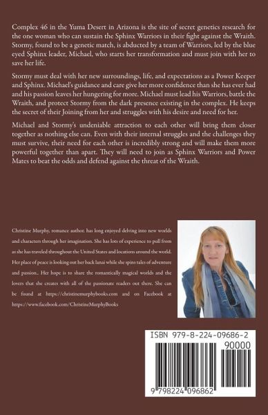 Complex 46 in the Yuma Desert in Arizona is the site of secret genetics research for the one woman who can sustain the Sphinx Warriors in their fight against the Wraith. Stormy, found to be a genetic match, is abducted by a team of Warriors, led by the blue eyed Sphinx leader, Michael, who starts her transformation and must join with her to save her life. Stormy must deal with her new surroundings, life, and expectations as a Power Keeper and Sphinx. Michael's guidance and care give her more confidence than she has ever had and his passion leaves her hungering for more. Michael must lead his Warriors, battle the Wraith, and protect Stormy from the dark presence existing in the complex. He keeps the secret of their Joining from her and struggles with his desire and need for her. Michael and Stormy's undeniable attraction to each other will bring them closer together as nothing else can. Even with their internal struggles and the challenges they must survive, their need for each other is incredibly strong and will make them more powerful together than apart. They will need to join as Sphinx Warriors and Power Mates to beat the odds and defend against the threat of the Wraith.