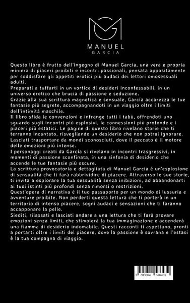 Questo libro nasce da un'idea di Manuel García, una vera e propria miniera di piaceri proibiti e incontri passionali, pensata appositamente per soddisfare gli appetiti erotici più audaci dei lettori adulti omosessuali.Preparatevi a tuffarvi in un vortice di desideri inconfessabili, in un universo erotico che brucia di passione e seduzione. Grazie alla sua scrittura magnetica e sensuale, García accarezza le vostre fantasie più segrete, accompagnandovi in un viaggio oltre i limiti dell'intimità maschile.Il libro sfida le convenzioni e infrange tutti i tabù, offrendo uno sguardo agli incontri più esplosivi, ai legami più profondi e ai piaceri più estatici. Le pagine di questo libro rivelano storie che vi terranno incantati, risvegliando un desiderio che non potrete ignorare.Lasciatevi trasportare da mondi sconosciuti, dove il peccato è il motore delle emozioni più intense. I personaggi creati da García si rivelano in incontri trasgressivi, in momenti di passione sconfinata, in una sinfonia di desiderio che accende le vostre fantasie più oscure.La scrittura provocatoria e dettagliata di Manuel García è un'esplosione di sensualità che vi farà rabbrividire di piacere. Attraverso le sue storie, vi invita a esplorare la vostra sessualità senza inibizioni, ad abbandonarvi ai vostri istinti più profondi senza rimorsi o restrizioni.Quest'opera di narrativa è il vostro passaporto per un mondo di lussuria e avventure proibite. Non perdetevi questa lettura che vi porterà in un territorio di piacere intenso, sogni audaci e sensazioni che vi faranno accapponare la pelle.Sedetevi, rilassatevi e lasciatevi andare a una lettura che vi farà provare emozioni senza limiti, che stimolerà la vostra immaginazione e accenderà una fiamma di desiderio indomabile. Questi racconti vi aspettano, pronti a portarvi oltre i limiti del piacere, dove la passione è sovrana e l'estasi è la vostra compagna di viaggio.