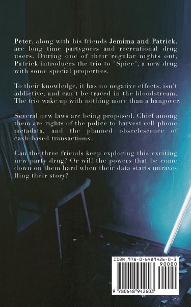 Peter, along with his friends Jemima and Patrick, are long time partygoers and recreational drug users. During one of their regular nights out, Patrick introduces the trio to "Spice", a new drug with some special properties. To their knowledge, it has no negative effects, isn't addictive, and can't be traced in the bloodstream. The trio wake up with nothing more than a hangover. Several new laws are being proposed. Chief among them are rights of the police to harvest cell phone metadata, and the planned obscelescence of cash-based transactions. Can the three friends keep exploring this exciting new party drug? Or will the powers that be come down on them when their data starts unravelling their story?