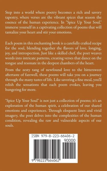 Step into a world where poetry becomes a rich and savory tapestry, where verses are the vibrant spices that season the essence of the human experience. In "Spice Up Your Soul," immerse yourself in a captivating collection of poems that will tantalize your heart and stir your emotions. Each poem in this enchanting book is a carefully crafted recipe for the soul, blending together the flavors of love, longing, joy, and introspection. Just like a skilled chef, the poet weaves words into intricate patterns, creating verses that dance on the tongue and resonate in the deepest chambers of the heart. From the zesty tang of newfound love to the bittersweet aftertaste of farewell, these poems will take you on a journey through the many tastes of life. Like savoring a fine meal, you'll relish the sensations that each poem evokes, leaving you hungering for more. "Spice Up Your Soul" is not just a collection of poems; it's an exploration of the human spirit, a celebration of our shared emotions and experiences. Through eloquent lines and vivid imagery, the poet delves into the complexities of the human condition, revealing the raw and vulnerable aspects of our souls. Each page is a feast for the senses, inviting you to savor the words and immerse yourself in the emotions they evoke. As you read, you'll find yourself nodding in recognition, for these poems speak to the universal truths that bind us all together. Whether you are a seasoned poetry connoisseur or a newcomer to the world of verse, "Spice Up Your Soul" promises an enriching and unforgettable experience. So, take a seat at the table of poetic delights, and let the words on these pages awaken your senses and nourish your soul. Prepare to be enchanted as the poet serves up a banquet of emotions that will leave you forever changed.