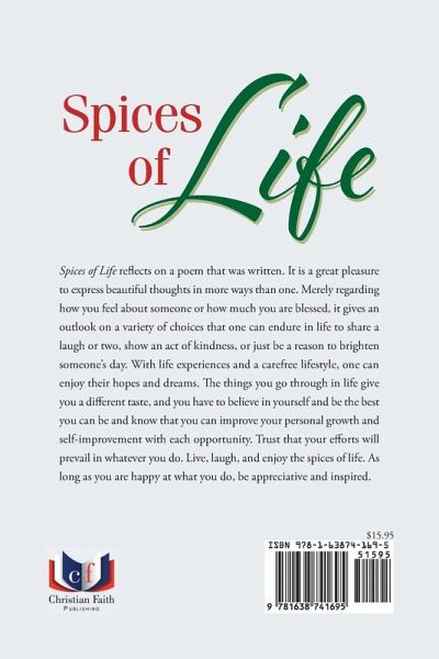 Spices of Life reflects on a poem that was written. It is a great pleasure to express beautiful thoughts in more ways than one. Merely regarding how you feel about someone or how much you are blessed, it gives an outlook on a variety of choices that one can endure in life to share a laugh or two, show an act of kindness, or just be a reason to brighten someone's day. With life experiences and a carefree lifestyle, one can enjoy their hopes and dreams. The things you go through in life give you a different taste, and you have to believe in yourself and be the best you can be and know that you can improve your personal growth and self-improvement with each opportunity. Trust that your efforts will prevail in whatever you do. Live, laugh, and enjoy the spices of life. As long as you are happy at what you do, be appreciative and inspired.