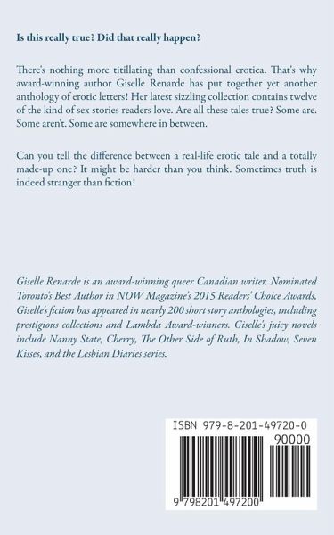 Is this really true? Did that really happen? There's nothing more titillating than confessional erotica. That's why award-winning author Giselle Renarde has put together yet another anthology of erotic letters! Her latest sizzling collection contains twelve of the kind of sex stories readers love. Are all these tales true? Some are. Some aren't. Some are somewhere in between. Can you tell the difference between a real-life erotic tale and a totally made-up one? It might be harder than you think. Sometimes truth is indeed stranger than fiction!