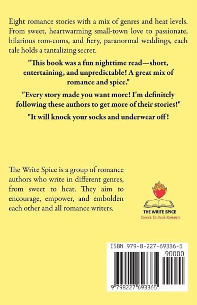 A collection of romance stories with a mix of genres and heat levels. Crafted by the talented authors of The Write Spice, this anthology offers everything from sweet, heartwarming love to fiery, passion-filled encounters. Whether you're drawn to contemporary love stories, enchanted by paranormal romance, or looking for a laugh with a rom-com twist, each tale holds a tantalizing secret at its core.