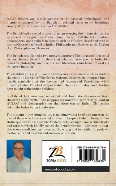 India's History was mostly written on the basis of Archeological and linguistic research by the British in colonial times or by historians employed by the English such as Max Muller. The British had a vested interest in not presenting the Indian civilization as ancient or as great as it was thought to be. Till the 18 th Century, philosophers and thinkers in Europe such as Voltaire, Hegel and even as late as Nietzsche referred to Indian Philosophy and Science, as the Mother of all Philosophes and Sciences. The British established a two-pronged strategy: First to postdate most of Indian History. Second to show that whatever was good in India like Sanskrit, philosophy,architecture, and literature, came from the west via the Aryan invasions. To establish this myth, some "discoveries" were made such as finding skeletons by Mortimer Wheeler in Mohenjo- Daro which prompted him to hastily conclude that the Aryans had "massacred Dravidians while invading India. This fact shapes Indian History till today, and this has been taught to the Indian children. Luckily of late new archaeological and linguistic discoveries have shattered many myths. The mapping of Saraswathi Riverbed by Landsat of NASA and photograph show that there was an Indian Civilization before the Indus Valley Civilization. The attempt at rewriting history is meeting with a lot of resistance on the part of those who have a vested interest in keeping Indian History under status quo as well as those who for decades have taught and written books and articles which blindly copied the British version. Contrary to that, this is one small treatise to correct the wrong and to justify the pride we feel for India and its great and ancient civilization.
