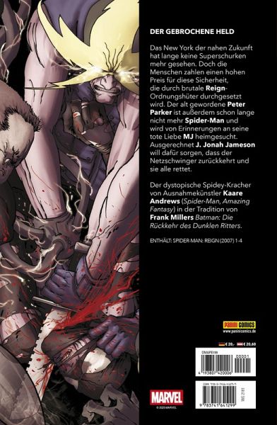 DER GEBROCHENE HELD Das New York der nahen Zukunft hat lange keine Superschurken mehr gesehen. Doch die Menschen zahlen einen hohen Preis für diese Sicherheit, die durch brutale Reign-Ordnungshüter durchgesetzt wird. Der alt gewordene Peter Parker ist außerdem schon lange nicht mehr Spider-Man und wird von Erinnerungen an seine tote Liebe MJ heimgesucht. Ausgerechnet J. Jonah Jameson will dafür sorgen, dass der Netzschwinger zurückkehrt und sie alle rettet. Der dystopische Spidey-Kracher von Ausnahmekünstler Kaare Andrews (Spider-Man, Amazing Fantasy) in der Tradition von Frank Millers Batman: Die Rückkehr des Dunklen Ritters. ENTHÄLT: SPIDER-MAN: REIGN (2007) 1-4