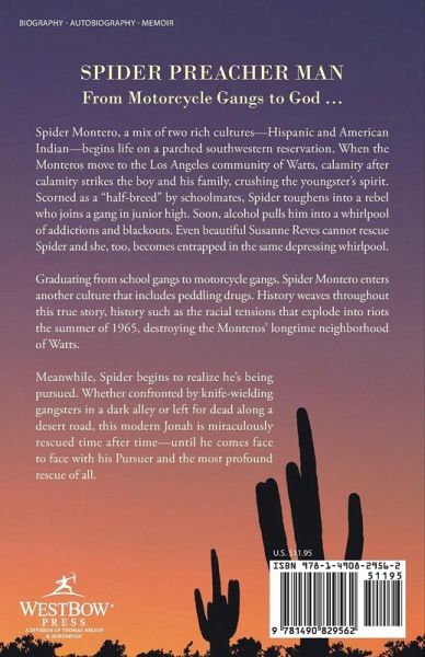 SPIDER PREACHER MAN From Motorcycle Gangs to God ? Spider Montero, a mix of two rich cultures?Hispanic and American Indian?begins life on a parched southwestern reservation. When the Monteros move to the Los Angeles community of Watts, calamity after calamity strikes the boy and his family, crushing the youngster?s spirit. Scorned as a ?half-breed? by schoolmates, Spider toughens into a rebel who joins a gang in junior high. Soon, alcohol pulls him into a whirlpool of addictions and blackouts. Even beautiful Susanne Reves cannot rescue Spider and she, too, becomes entrapped in the same depressing whirlpool. Graduating from school gangs to motorcycle gangs, Spider Montero enters another culture that includes peddling drugs. History weaves throughout this true story, history such as the racial tensions that explode into riots the summer of 1965, destroying the Monteros? longtime neighborhood of Watts. Meanwhile, Spider begins to realize he?s being pursued. Whether confronted by knife-wielding gangsters in a dark alley or left for dead along a desert road, this modern Jonah is miraculously rescued time after time?until he comes face to face with his Pursuer and the most profound rescue of all.