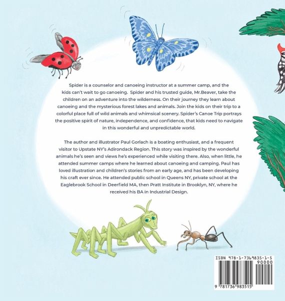 Spider is a counselor and canoeing instructor at a summer camp, and the kids can't wait to go canoeing. Spider and his trusted guide, Mr. Beaver, take the children on an adventure into the wilderness. On their journey they learn about canoeing and the mysterious forest lakes and animals. Join the kids on their trip to a colorful place full of wild animals and whimsical scenery. Spider's Canoe Trip portrays the positive spirit of nature, independence, and confidence, that kids need to navigate in this wonderful and unpredictable world.