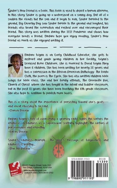 Spider's New Friend is a Fable. This fable is used to depict a human dilemma, In this story Spider is going up a waterspout on a sunny day. But all of a sudden the clouds hid the sun and it begin to rain, Spider tumbled to the ground, Big Grouchy Bug saw Spider tumble to the ground and laughed, his friends also heard the commotion and rushed over and encouraged their friend. This story was written during the 2021 Pandemic and shows how everyone needs a friend. Dirdura hope you enjoy reading, Spider's New Friend as much as she enjoyed writing it.