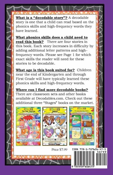 An engaging and motivating non-fiction children's book about spiders, perfect for new readers with budding letter sound and decoding knowledge! This decodable book moves through 4 difficulty levels, based on phonics knowledge, and each chapter builds on the one before. Children are prompted to learn new skills, at an appropriate pace, to be able to go on to read the next chapter. STAGES books are formatted in a special way to have new readers focus on only decoding first. In these books, the text is on the right-hand side of the book, and the picture that matches that text is on the next page (instead of the text and picture being side by side). This is so the readers read the text alone, without the aid of a picture that may give them a clue as to what a word may be. After they read the text, they turn the page to confirm meaning of what they read and build engagement and enjoyment! Each story has comprehension questions, including one that helps the reader connect the story to their own life. For the phonics skills listed below, the book contains descriptions of what they mean (for example, a "digraph" is two letters that when put together make a whole new sound. For example, ch, th, and sh). Chapter One, On a Web: Phonics Skills: Consonants f, s, n, l, g, h, p, c, b, w, r, d; Short Vowels: a, e, i, o, u; Word Endings: -s; High-Frequency Words: the; Description: In this first chapter, the reader reads simple sentences that describe spiders. Chapter Two, Spider Facts: Phonics Skills: Add all remaining consonants, beginning and ending blends, K sound spelled "ck"; High-Frequency Words: spider, to, when, of, this; Description: The reader reads about what some spiders can do. Chapter Three, Kinds of Spiders: Phonics Skills: Add double consonants, digraphs, and silent e; Word Endings: Add -ing; High-Frequency Words: they, food, by, look, do, or, have; Description: This chapter reveals specific details about six different types of spiders, including a wolf spider and a jumping spider. Chapter Four, Spiders Hunting: Phonics Skills: Add r-controlled vowels and compound words; Word Endings: Add -es and -ly; High-Frequency Words: way, one, their, means, out; Description: In this final chapter, read about the fascinating different ways that spiders hunt, including the funnel spider that drags prey into its funnel-shaped web. Frequently Asked Questions What is a "decodable story"? A decodable story is one that a child can read based on the phonics skills and high-frequency words they have learned. What ages is this book suited for? Children near the end of Kindergarten and through First Grade will have typically learned these phonics skills and high-frequency words. Where can I find more decodable books like this? There are three other Stages Books currently on the market: two fiction books, The Pals' Playtime and Pat and Tim Fun Times and another non-fiction book, Dogs.