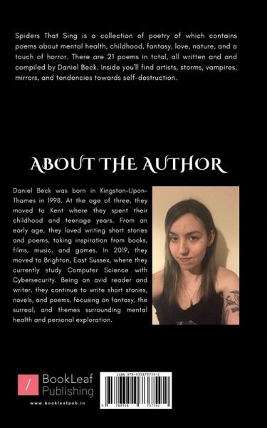 Spiders That Sing is a collection of poetry of which contains poems about mental health, childhood, fantasy, love, nature, and a touch of horror. There are 21 poems in total, all written and and compiled by Daniel Beck. Inside you'll find artists, storms, vampires, mirrors, and tendencies towards self-destruction.