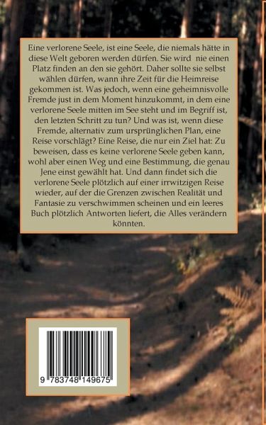 Eine verlorene Seele, ist eine Seele, die niemals hätte in diese Welt geboren werden dürfen. Sie wird nie einen Platz finden an den sie gehört. Daher sollte sie selbst wählen dürfen, wann ihre Zeit für die Heimreise gekommen ist. Was jedoch, wenn eine geheimnisvolle Fremde just in dem Moment hinzukommt, in dem eine verlorene Seele mitten im See steht und im Begriff ist, den letzten Schritt zu tun? Und was ist, wenn diese Fremde, alternativ zum ursprünglichen Plan, eine Reise vorschlägt? Eine Reise, die nur ein Ziel hat: Zu beweisen, dass es keine verlorene Seele geben kann, wohl aber einen Weg und eine Bestimmung, die genau Jene einst gewählt hat. Und dann findet sich die verlorene Seele plötzlich auf einer irrwitzigen Reise wieder, auf der die Grenzen zwischen Realität und Fantasie zu verschwimmen scheinen und ein leeres Buch plötzlich Antworten liefert, die Alles verändern könnten