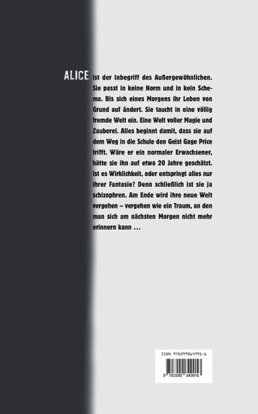 Alice ist der Inbegriff des Außergewöhnlichen. Sie passt in keine Norm und in kein Schema. Bis sich eines Morgens ihr Leben von Grund auf ändert. Sie taucht in eine völlig fremde Welt ein. Eine Welt voller Magie und Zauberei. Alles beginnt damit, dass sie auf dem Weg in die Schule den Geist Gage Price trifft. Wäre er ein normaler Erwachsener, hätte sie ihn auf etwa 20 Jahre geschätzt. Ist es Wirklichkeit, oder entspringt alles nur ihrer Fantasie? Denn schließlich ist sie ja schizophren. Am Ende wird ihre neue Welt vergehen - vergehen wie ein Traum, an den man sich am nächsten Morgen nicht mehr erinnern kann ...