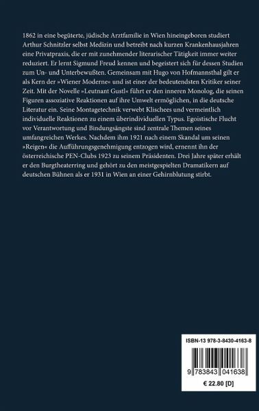 1862 in eine begüterte, jüdische Arztfamilie in Wien hineingeboren studiert Arthur Schnitzler selbst Medizin und betreibt nach kurzen Krankenhausjahren eine Privatpraxis, die er mit zunehmender literarischer Tätigkeit immer weiter reduziert. Er lernt Sigmund Freud kennen und begeistert sich für dessen Studien zum Un- und Unterbewußten. Gemeinsam mit Hugo von Hofmannsthal gilt er als Kern der "Wiener Moderne" und ist einer der bedeutendsten Kritiker seiner Zeit. Mit der Novelle "Leutnant Gustl" führt er den inneren Monolog, die seinen Figuren assoziative Reaktionen auf ihre Umwelt ermöglichen, in die deutsche Literatur ein. Seine Montagetechnik verwebt Klischees und vermeintlich individuelle Reaktionen zu einem überindividuellen Typus. Egoistische Flucht vor Verantwortung und Bindungsängste sind zentrale Themen seines umfangreichen Werkes. Nachdem ihm 1921 nach einem Skandal um seinen "Reigen" die Aufführungsgenehmigung entzogen wird, ernennt ihn der österreichische PEN-Clubs 1923 zu seinem Präsidenten. Drei Jahre später erhält er den Burgtheaterring und gehört zu den meistgespielten Dramatikern auf deutschen Bühnen als er 1931 in Wien an einer Gehirnblutung stirbt.