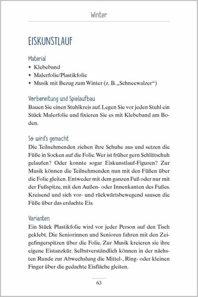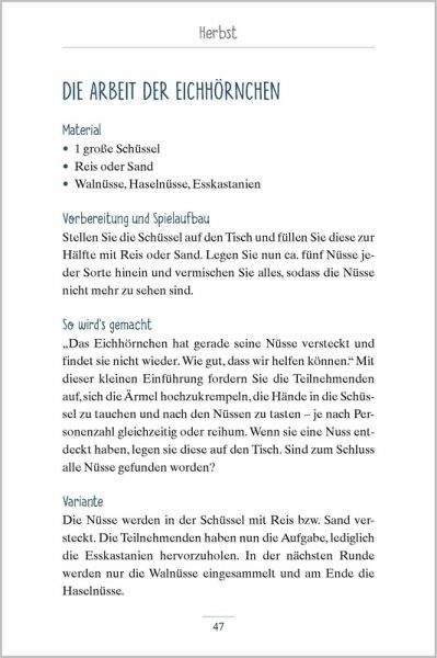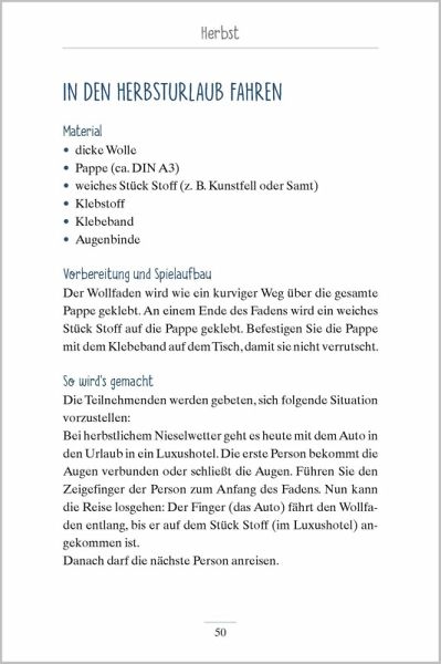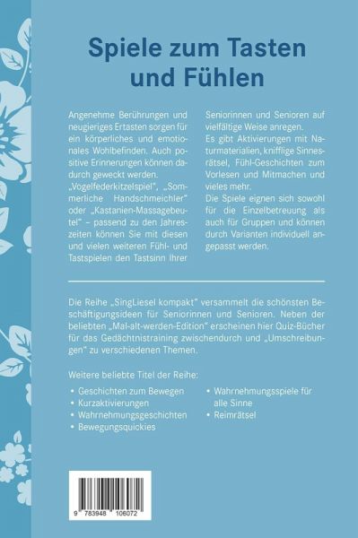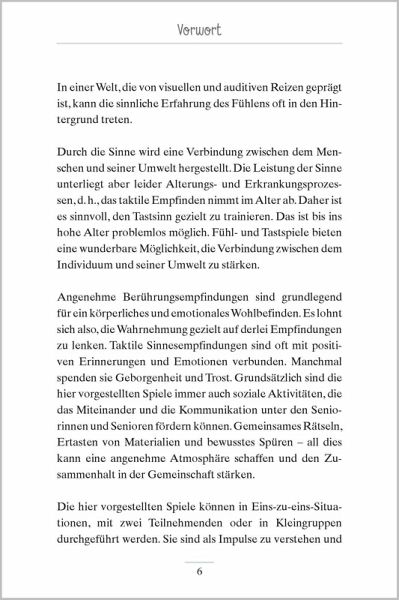Angenehme Berührungen und neugieriges Ertasten sorgen für ein körperliches und emotionales Wohlbefinden. Auch positive Erinnerungen können dadurch geweckt werden. "Vogelfederkitzelspiel", "Sommerliche Handschmeichler" oder "Kastanien-Massagebeutel" - passend zu den Jahreszeiten können Sie mit diesen und vielen weiteren Fühl- und Tastspielen den Tastsinn Ihrer Seniorinnen und Senioren auf vielfältige Weise anregen.Es gibt Aktivierungen mit Naturmaterialien, knifflige Sinnesrätsel, Fühl-Geschichten zum Vorlesen und Mitmachen und vieles mehr.Die Spiele eignen sich sowohl für die Einzelbetreuung als auch für Gruppen und können durch Varianten individuell angepasstwerden.