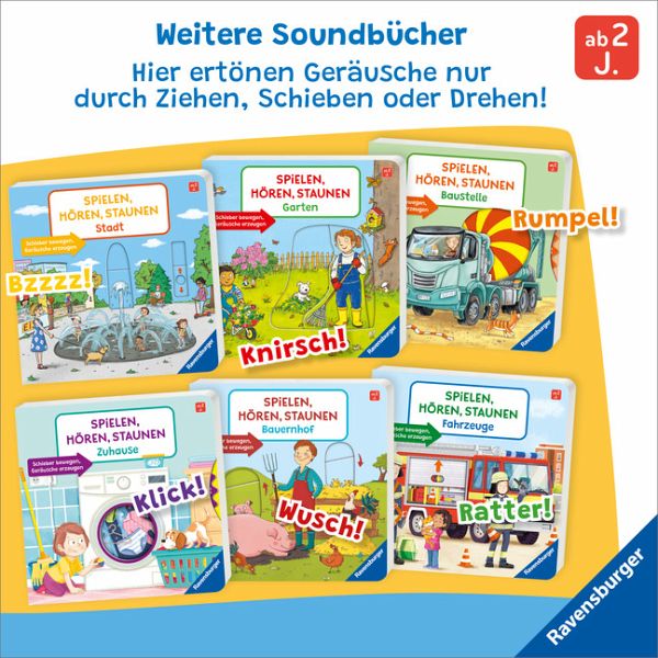 Die Bücher der "Spielen, Hören, Staunen"-Reihe sind Soundbücher der besonderen Art: sie kommen komplett ohne Elektronik oder Batterien aus, da allein durch die Bewegung von Schiebeelementen auf den Seiten verschiedenste Geräusche erzeugt werden können.