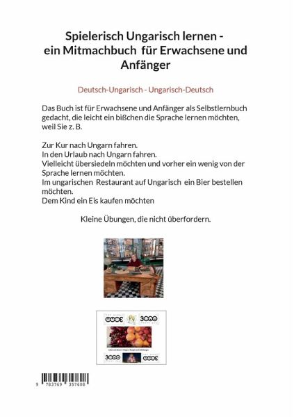 Spielerisch Ungarisch lernen - ein Mitmachbuch für Erwachsene und Anfänger Deutsch-Ungarisch - Ungarisch-Deutsch Das Buch ist für Erwachsene und Anfänger als Selbstlernbuch gedacht, die leicht ein bisschen die Sprache lernen möchten, weil Sie z. B. Zur Kur nach Ungarn fahren In den Urlaub nach Ungarn fahren Vielleicht übersiedeln möchten und vorher ein wenig von der Sprache lernen möchten Im ungarischen Restaurant auf Ungarisch ein Bier bestellen möchten Dem Kind ein Eis kaufen möchten Kleine Übungen, die nicht überfordern. Die Lösungen finden Sie direkt auf der nächsten Seite oder im Antwortteil.
