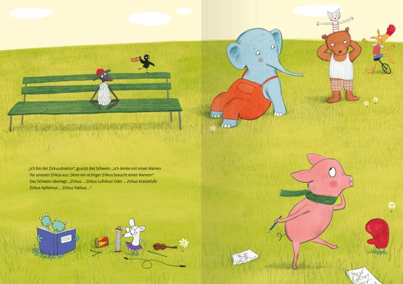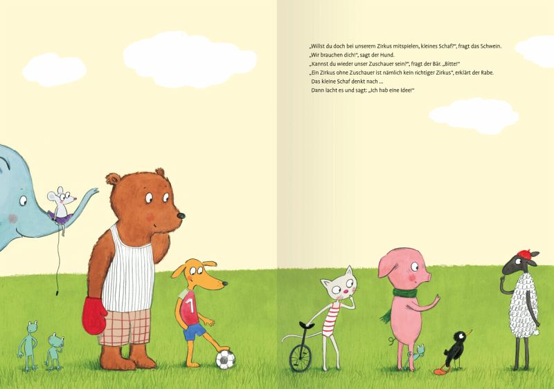 Katze, Schwein, Hund, Elefant, Bär, Schaf und co treffen sich zum Spielen. Schnell sind sich alle einig, es soll ein Zirkus werden und die Artistenrollen werden verteilt. Doch nur das kleine Schaf möchte lieber nur zuschauen und nicht vor den anderen auftreten. Als die anderen dies nicht zulassen,
