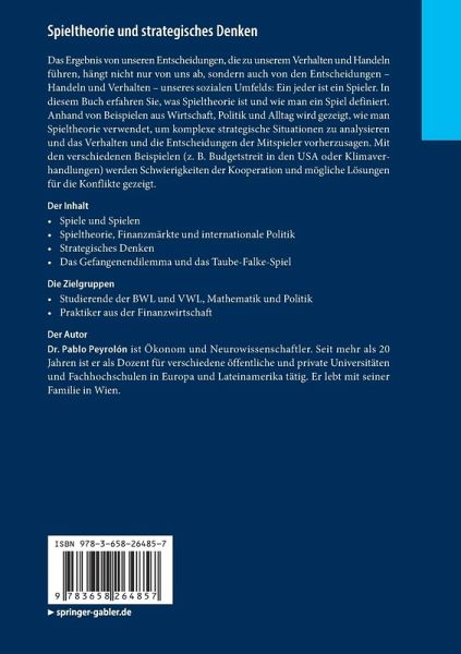 Das Ergebnis von unseren Entscheidungen, die zu unserem Verhalten und Handeln führen, hängt nicht nur von uns ab, sondern auch von den Entscheidungen - Handeln und Verhalten - unseres sozialen Umfelds: Ein jeder ist ein Spieler. In diesem Buch erfahren Sie, was Spieltheorie ist und wie man ein Spiel definiert. Anhand von Beispielen aus Wirtschaft, Politik und Alltag wird gezeigt, wie man Spieltheorie verwendet, um komplexe strategische Situationen zu analysieren und das Verhalten und die Entscheidungen der Mitspieler vorherzusagen. Mit den verschiedenen Beispielen (z. B. Budgetstreit in den USA oder Klimaverhandlungen) werden Schwierigkeiten der Kooperation und mögliche Lösungen für die Konflikte gezeigt.