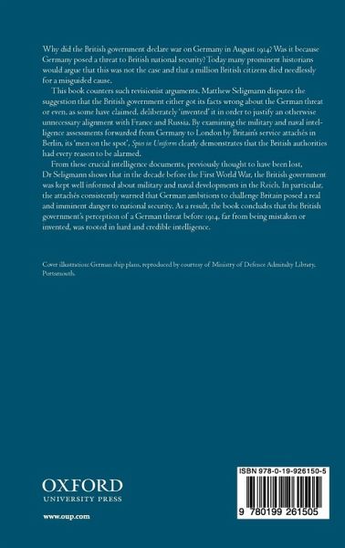 Why did the British government declare war on Germany in August 1914? Was it because Germany posed a threat to British national security? Today many prominent historians would argue that this was not the case and that a million British citizens died needlessly for a misguided cause. This book counters such revisionist arguments. Matthew Seligmann disputes the suggestion that the British government either got its facts wrong about the German threat or even, as some have claimed, deliberately 'invented' it in order to justify an otherwise unnecessary alignment with France and Russia. By examining the military and naval intelligence assessments forwarded from Germany to London by Britain's service attachés in Berlin, its 'men on the spot', Spies in Uniform clearly demonstrates that the British authorities had every reason to be alarmed. From these crucial intelligence documents, previously thought to have been lost, Dr Seligmann shows that in the decade before the First World War, the British government was kept well informed about military and naval developments in the Reich. In particular, the attachés consistently warned that German ambitions to challenge Britain posed a real and imminent danger to national security. As a result, the book concludes that the British government's perception of a German threat before 1914, far from being mistaken or invented, was rooted in hard and credible intelligence.
