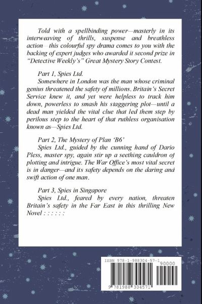 Part 1, Spies Ltd. Somewhere in London was the man whose criminal genius threatened the safety of millions. Britain's Secret Service knew it, and yet were helpless to track him down, powerless to smash his staggering plot-until a dead man yielded the vital clue that led them step by perilous step to the heart of that ruthless organisation known as-Spies Ltd. Part 2, The Mystery of Plan 'B6' Spies Ltd., guided by the cunning hand of Dario Pless, master spy, again stir up a seething cauldron of plotting and intrigue. The War Office's most vital secret is in danger-and its safety depends on the daring and swift action of one man. Part 3, Spies in Singapore Spies Ltd., feared by every nation, threaten Britain's safety in the Far East in this thrilling New Novel : : : : : : From Detective Weekly 1935 England.