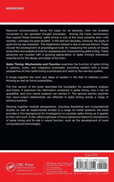 Neuronal communication forms the basis for all behavior, from the smallest movement to our grandest thought processes. Among the many mechanisms that support these functions, spike timing is among the most powerful and-until recently-perhaps the least studied. In the last two decades, however, the study of spike timing has exploded. The heightened interest is due to several factors. These include the development of physiological tools for measuring the activity of neural ensembles and analytical tools for assessing and characterizing spike timing. These advances are coupled with a growing appreciation of spike timing's theoretical importance for the design principles of the brain. Spike Timing: Mechanisms and Function examines the function of spike timing in sensory, motor, and integrative processes, providing readers with a broad perspective on how spike timing is produced and used by the nervous system. It brings together the work and ideas of leaders in the field to address current thinking as well as future possibilities. The first section of the book describes the foundation for quantitative analysis and theory. It examines the information contained in spike timing, how it can be quantified, and how neural systems can extract it. The second section explores how input-output relationships are reflected in spike timing across a range of sensory systems. Drawing together multiple perspectives, including theoretical and computational studies as well as experimental studies in a range of model systems, the book provides a firm background for investigators to consider spike timing as it applies to their own work. It also offers a glimpse of future advances related to mechanisms of spike timing and its role in neural function, such as the development of novel computational technologies.