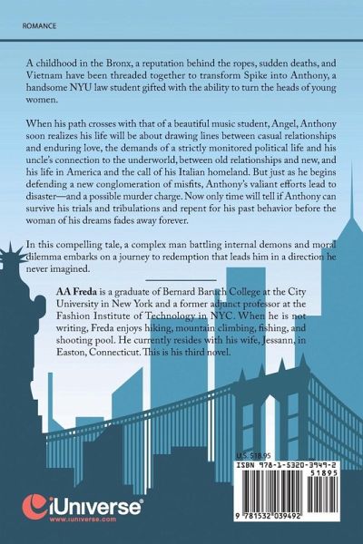 A childhood in the Bronx, a reputation behind the ropes, sudden deaths, and Vietnam have been threaded together to transform Spike into Anthony, a handsome NYU law student gifted with the ability to turn the heads of young women. When his path crosses with that of a beautiful music student, Angel, Anthony soon realizes his life will be about drawing lines between casual relationships and enduring love, the demands of a strictly monitored political life and his uncles connection to the underworld, between old relationships and new, and his life in America and the call of his Italian homeland. But just as he begins defending a new conglomeration of misfits, Anthonys valiant efforts lead to disasterand a possible murder charge. Now only time will tell if Anthony can survive his trials and tribulations and repent for his past behavior before the woman of his dreams fades away forever. In this compelling tale, a complex man battling internal demons and moral dilemma embarks on a journey to redemption that leads him in a direction he never imagined.