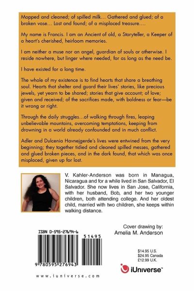 Mopped and cleaned; of spilled milk . . . Gathered and glued; of a broken vase . . . Lost and found; of a misplaced treasure . . . . My name is Francis. I am an Ancient of old, a Storyteller, a Keeper of a heart's cherished, heirloom memories. I am neither a muse nor an angel, guardian of souls or otherwise. I reside nowhere, but linger where needed, for as long as the need be. I have existed for a long time. The whole of my existence is to find hearts that share a breathing soul. Hearts that shelter and guard their lives' stories, like precious jewels, yet yearn to be shared; stories that give account; of love; given and received; of the sacrifices made, with boldness or fear--be it wrong or right. Through the daily struggles . . . of walking through fires, leaping unbelievable mountains, overcoming temptations, keeping from drowning in a world already confounded and in much conflict. Adler and Dulcenia Havnejgerde's lives were entwined from the very beginning; they together tidied and cleaned spilled messes, gathered and glued broken pieces, and in the dark found, that which was once misplaced, given up for lost.