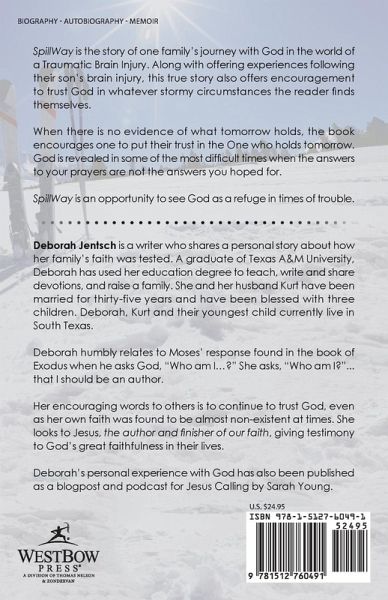 SpillWay is the story of one family’s journey with God in the world of a Traumatic Brain Injury. Along with offering experiences following their son’s brain injury, this true story also offers encouragement to trust God in whatever stormy circumstances the reader finds themselves. When there is no evidence of what tomorrow holds, the book encourages one to put their trust in the One who holds tomorrow. God is revealed in some of the most difficult times when the answers to your prayers are not the answers you hoped for. SpillWay is an opportunity to see God as a refuge in times of trouble.