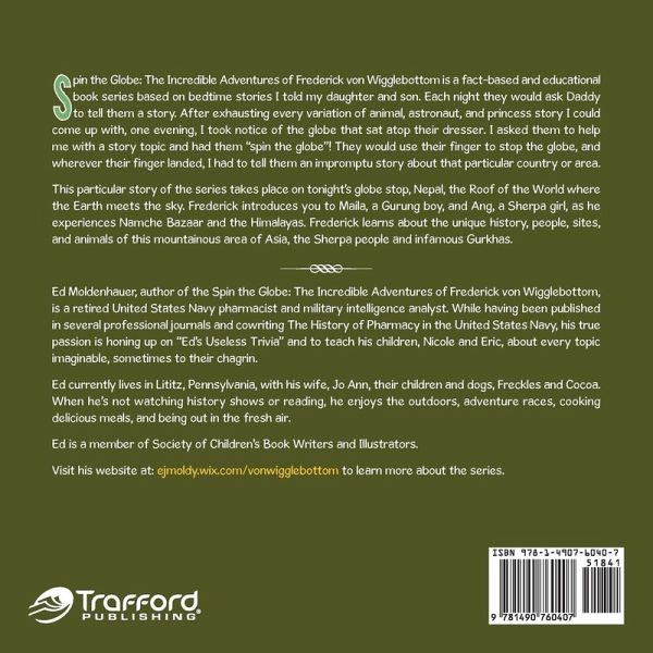 Spin the Globe: The Incredible Adventures of Frederick von Wigglebottom is a fact-based and educational book series based on bedtime stories I told my daughter and son. Each night they would ask Daddy to tell them a story. After exhausting every variation of animal, astronaut, and princess story I could come up with, one evening, I took notice of the globe that sat atop their dresser. I asked them to help me with a story topic and had them "spin the globe"! They would use their finger to stop the globe, and wherever their finger landed, I had to tell them an impromptu story about that particular country or area. This particular story of the series takes place on tonight's globe stop, Nepal, the Roof of the World where the Earth meets the sky. Frederick introduces you to Maila, a Gurung boy, and Ang, a Sherpa girl, as he experiences Namche Bazaar and the Himalayas. Frederick learns about the unique history, people, sites, and animals of this mountainous area of Asia, the Sherpa people and infamous Gurkhas.