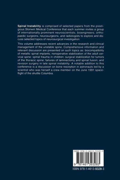 I. Basic Science.- 1 Growth and Repair of Mineralized Osteoblasts.- 2 Spinal Stability and Instability as Defined by the Louis Three-Column Spine Concept.- 3 Dysfunction of the Spinal Stability System and Its Restabilization.- 4 Pathophysiology of the Nerve Roots in the Lumbar Spine.- 5 Biocompatibility of Metallic Spinal Implants.- II. Clinical Aspects of Instability.- A. Basic Concepts.- 6 Spinal Stabilization: Is Fusion the Right Way?.- 7 The Diagnosis and Treatment of Instability in Collapsing Degenerative Lumbar Scoliosis.- 8 Vertebral Injury and Instability.- 9 Nonoperative Stabilization of the Adult Cervical Spine.- B. Operative Management: The Pediatric Spine.- 10 Instability of the Spine Secondary to the Treatment of Intraspinal Tumors in Children: Diagnosis, Cure, and Prevention.- 11 Spinal Trauma in Children.- C. Operative Management: The Adult Spine.- 12 Operative Management of Occipitocervical and Atlantoaxial Instability.- 13 Surgical Stabilization for Tumors of the Thoracic Spine.- 14 Surgical Treatment of the Unstable Thoracic Spine in Trauma and Infection.- 15 The Lateral Extracavitary Approach to the Thoracic and Lumbar Spine.- 16 Lumbar Spine Instability.- 17 The Mechanical Stability of Lumbosacral Spondylolisthesis.- 18 The Surgical Treatment of Failures of Laminectomy and Spinal Fusion.- 19 Revision Surgery in Late Spine Instability, Including Sacral Stabilization.- 20 Training the Future Spinal Surgeon.- Closing Remarks.