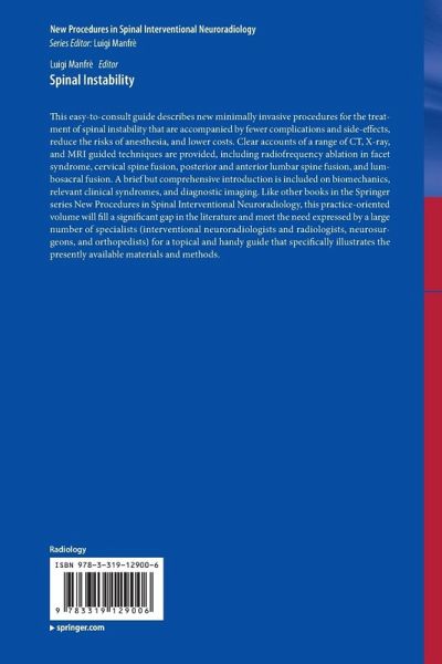 This easy-to-consult guide describes new minimally invasive procedures for the treatment of spinal instability that are accompanied by fewer complications and side-effects, reduce the risks of anesthesia, and lower costs. Clear accounts of a range of CT, X-ray, and MRI guided techniques are provided, including radiofrequency ablation in facet syndrome, cervical spine fusion, posterior and anterior lumbar spine fusion, and lumbosacral fusion. A brief but comprehensive introduction is included on biomechanics, relevant clinical syndromes, and diagnostic imaging. Like other books in the Springer series New Procedures in Spinal Interventional Neuroradiology, this practice-oriented volume will fill a significant gap in the literature and meet the need expressed by a large number of specialists (interventional neuroradiologists and radiologists, neurosurgeons, and orthopedists) for a topical and handy guide that specifically illustrates the presently available materials and methods.