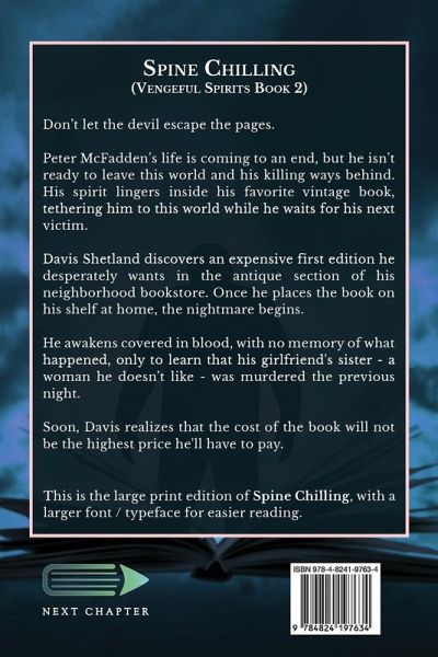 Don't let the devil escape the pages. Peter McFadden's life is coming to an end, but he isn't ready to leave this world and his killing ways behind. His spirit lingers inside his favorite vintage book, tethering him to this world while he waits for his next victim. Davis Shetland discovers an expensive first edition he desperately wants in the antique section of his neighborhood bookstore. Once he places the book on his shelf at home, the nightmare begins. He awakens covered in blood, with no memory of what happened, only to learn that his girlfriend's sister - a woman he doesn't like - was murdered the previous night. Soon, Davis realizes that the cost of the book will not be the highest price he'll have to pay. This is the large print edition of Spine Chilling, with a larger font / typeface for easier reading.