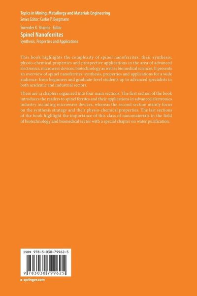 There are 15 chapters organized into four main sections. The first section of the book introduces the readers to spinel ferrites and their applications in advanced electronics industry including microwave devices, whereas the second section mainly focus on the synthesis strategy and their physio-chemical properties. The last sections of the book highlight the importance of this class of nanomaterials in the field of biotechnology and biomedical sector with a special chapter on water purification.