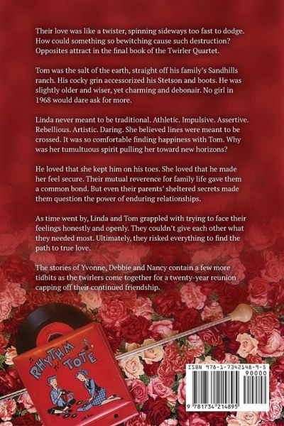 Their love was like a twister, spinning sideways too fast to dodge. How could something so bewitching cause such destruction? Opposites attract in the final book of the Twirler Quartet. Tom was the salt of the earth, straight off his family's Sandhills ranch. His cocky grin accessorized his Stetson and boots. He was slightly older and wiser, yet charming and debonair. No girl in 1968 would dare ask for more. Linda never meant to be traditional. Athletic. Impulsive. Assertive. Rebellious. Artistic. Daring. She believed lines were meant to be crossed. It was so comfortable finding happiness with Tom. Why was her tumultuous spirit pulling her toward new horizons? He loved that she kept him on his toes. She loved that he made her feel secure. Their mutual reverence for family life gave them a common bond. But even their parents' sheltered secrets made them question the power of enduring relationships. As time went by, Linda and Tom grappled with trying to face their feelings honestly and openly. They couldn't give each other what they needed most. Ultimately, they risked everything to find the path to true love. The stories of Yvonne, Debbie, and Nancy contain a few more tidbits as the twirlers come together for a twenty-year reunion capping off their continued friendship.