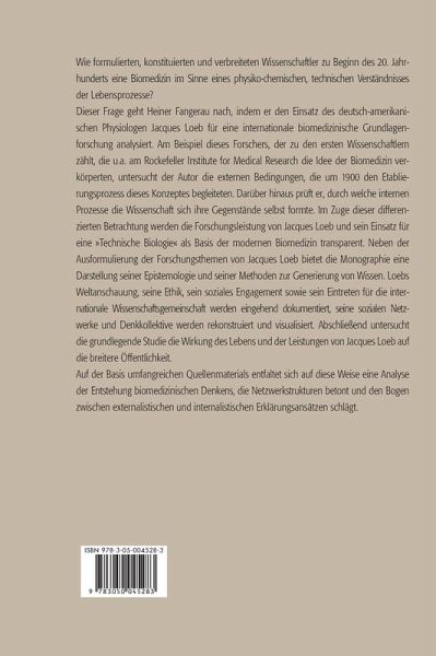Wie formulierten, konstituierten und verbreiteten Wissenschaftler zu Beginn des 20. Jahrhunderts eine Biomedizin im Sinne eines physiko-chemischen, technischen Verständnisses der Lebensprozesse? Dieser Frage geht Heiner Fangerau nach, indem er den Einsatz des deutsch-amerikanischen Physiologen Jacques Loeb für eine internationale biomedizinische Grundlagenforschung analysiert. Am Beispiel dieses Forschers, der zu den ersten Wissenschaftlern zählt, die u.a. am Rockefeller Institute for Medical Research die Idee der Biomedizin verkörperten, untersucht der Autor die externen Bedingungen, die um 1900 den Etablierungsprozess dieses Konzeptes begleiteten. Darüber hinaus prüft er, durch welche internen Prozesse die Wissenschaft sich ihre Gegenstände selbst formte. Im Zuge dieser differenzierten Betrachtung werden die Forschungsleistung von Jacques Loeb und sein Einsatz für eine "Technische Biologie" als Basis der modernen Biomedizin transparent. Neben der Ausformulierung der Forschungsthemen von Jacques Loeb bietet die Monographie eine Darstellung seiner Epistemologie und seiner Methoden zur Generierung von Wissen. Loebs Weltanschauung, seine Ethik, sein soziales Engagements sowie sein Eintreten für die internationale Wissenschaftsgemeinschaft werden eingehend dokumentiert, seine sozialen Netzwerke und Denkkollektive werden rekonstruiert und visualisiert. Abschließend untersucht die grundlegende Studie die Wirkung des Lebens und der Leistungen von Jacques Loeb auf die breitere Öffentlichkeit. Auf der Basis umfangreichen Quellenmaterials entfaltet sich auf diese Weise eine Analyse der Entstehung biomedizinischen Denkens, die Netzwerkstrukturen betont und den Bogen zwischen externalistischen und internalistischen Erklärungsansätzen schlägt.