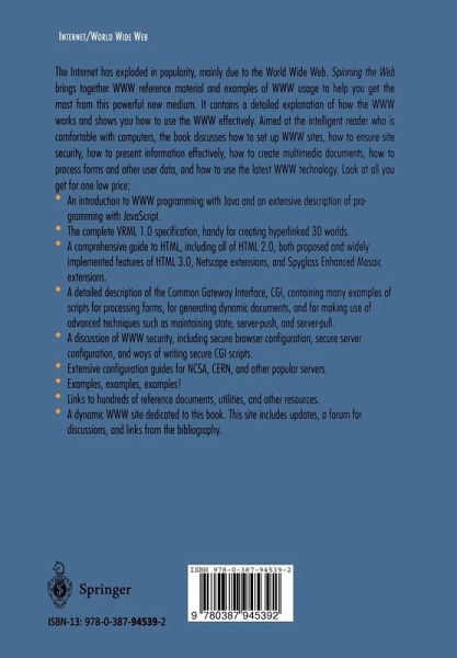 1 What, How, Where?.- 1.1 The Internet.- 1.2 Connecting to the Internet.- 1.3 Internet Applications.- 1.4 The WWW.- 2 How the Web Works.- 2.1 WWW Browsers.- 2.2 Client/Server Interaction.- 2.3 MIME Types.- 2.4 External Viewers.- 2.5 Executing Local Programs from Hyperlinks.- 2.6 Servers.- 3 HTTP.- 3.1 The HTTP Request.- 3.2 The HTTP Response.- 3.3 Status Codes.- 3.4 HTTP Security.- 4 Servers.- 4.1 Setting up NCSA httpd.- 4.2 Using NCSA httpd Features.- 4.3 Using the NCSA Server.- 4.4 NCSA httpd Security Considerations.- 4.5 Setting up CERN httpd.- 4.6 Using CERN httpd Features.- 4.7 Netscape Servers.- 4.8 Apache.- 4.9 Other Servers.- 5 Security.- 5.1 Server Security.- 5.2 CGI Security.- 5.3 Client Security.- 5.4 Firewalls.- 6 HTML.- 6.1 Quick and Dirty.- 6.2 The Fine Print.- 6.3 Writing HTML.- 6.4 HTML Text Elements.- 6.5 HTML Anchors.- 6.6 Rules and Images.- 6.7 HTML Forms.- 6.8 Common HTML Errors.- 6.9 HTML Style.- 6.10 The Future of HTML.- 6.11 Copyrights.- 7 HTML Reference.- 7.1 Syntax.- 7.2 The HTML Document.- 7.3 The HTML Body.- 7.4 HTML Anchors.- 7.5 Headers.- 7.6 Text Tags.- 7.7 Addresses.- 7.8 Lists.- 7.9 Special Characters.- 7.10 Images and Rules.- 7.11 Embedded Objects.- 7.12 Tables.- 7.13 Frames.- 7.14 HTML Forms.- 7.15 Java and JavaScript.- 7.16 HTML 3.- 8 Advanced HTML Examples.- 8.1 Alignment.- 8.2 Rules.- 8.3 Images.- 8.4 Lists.- 8.5 Anchors.- 8.6 Truly Nasty and Naughty.- 8.7 Frame Documents.- 8.8 Forms.- 9 CGI Scripts.- 9.1 Very Plain CGI Script.- 9.2 The CGI Header.- 9.3 The No-Parse-Header CGI Script.- 9.4 The Script Data.- 9.5 A Bigger Example in C.- 9.6 An Example in Perl.- 9.7 The Environment Variables.- 9.8 Script Security: Shells, Perl, C, or What?.- 9.9 Debugging CGI Scripts.- 9.10 CGI Examples.- 10 Tricks.- 10.1 Images.- 10.2 Serving Sounds.-10.3 Serving Video.- 10.4 Server-Side Includes.- 10.5 Indexing Your Pages.- 11 WWW Utilities.- 11.1 WWW Indices and Other Information Services.- 11.2 Image Tbols.- 11.3 Helper Applications/External Viewers.- 11.4 HTML Editors.- 11.5 Converters to HTML.- 11.6 Converters from HTML.- 11.7 HTML Checkers.- 11.8 Proxies and Packet Filters.- 11.9 HTTP Log Parsers.- 11.10 CGI Programming.- 12 Java and JavaScript.- 12.1 A Sample Java Program.- 12.2 A Brief Java Overview by Example.- 12.3 JavaScript.- 12.4 JavaScript Examples.- 12.5 JavaScript Operators.- 12.6 The JavaScript Language.- 12.7 JavaScript Statements.- 12.8 JavaScript Objects.- 12.9 More JavaScript Examples.- 13 VRML.- 13.1 VRML Files.- 13.2 Field Values.- 13.3 Nodes.- 13.4 VRML Usage.- Appendixes.- A Uniform Resource Locators.- B Country Code Domain Names.- C Strftime Format Strings.- References.