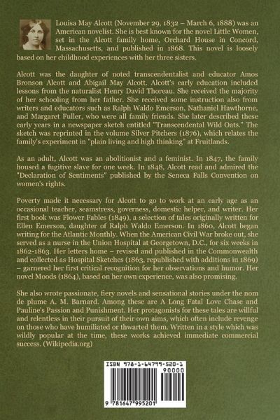 Louisa May Alcott (November 29, 1832 – March 6, 1888) was an American novelist. She is best known for the novel Little Women, set in the Alcott family home, Orchard House in Concord, Massachusetts, and published in 1868. This novel is loosely based on her childhood experiences with her three sisters. Alcott was the daughter of noted transcendentalist and educator Amos Bronson Alcott and Abigail May Alcott. Alcott's early education included lessons from the naturalist Henry David Thoreau. She received the majority of her schooling from her father. She received some instruction also from writers and educators such as Ralph Waldo Emerson, Nathaniel Hawthorne, and Margaret Fuller, who were all family friends. She later described these early years in a newspaper sketch entitled "Transcendental Wild Oats." The sketch was reprinted in the volume Silver Pitchers (1876), which relates the family's experiment in "plain living and high thinking" at Fruitlands. As an adult, Alcott was an abolitionist and a feminist. In 1847, the family housed a fugitive slave for one week. In 1848, Alcott read and admired the "Declaration of Sentiments" published by the Seneca Falls Convention on women's rights. Poverty made it necessary for Alcott to go to work at an early age as an occasional teacher, seamstress, governess, domestic helper, and writer. Her first book was Flower Fables (1849), a selection of tales originally written for Ellen Emerson, daughter of Ralph Waldo Emerson. In 1860, Alcott began writing for the Atlantic Monthly. When the American Civil War broke out, she served as a nurse in the Union Hospital at Georgetown, D.C., for six weeks in 1862-1863. Her letters home – revised and published in the Commonwealth and collected as Hospital Sketches (1863, republished with additions in 1869) – garnered her first critical recognition for her observations and humor. Her novel Moods (1864), based on her own experience, was also promising. She also wrote passionate, fiery novels and sensational stories under the nom de plume A. M. Barnard. Among these are A Long Fatal Love Chase and Pauline's Passion and Punishment. Her protagonists for these tales are willful and relentless in their pursuit of their own aims, which often include revenge on those who have humiliated or thwarted them. Written in a style which was wildly popular at the time, these works achieved immediate commercial success. (Wikipedia.org)