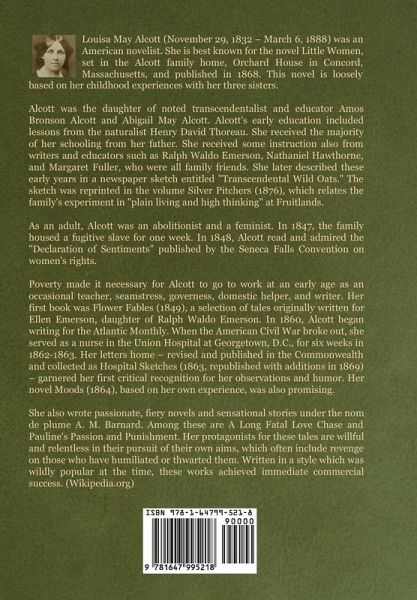 Louisa May Alcott (November 29, 1832 - March 6, 1888) was an American novelist. She is best known for the novel Little Women, set in the Alcott family home, Orchard House in Concord, Massachusetts, and published in 1868. This novel is loosely based on her childhood experiences with her three sisters. Alcott was the daughter of noted transcendentalist and educator Amos Bronson Alcott and Abigail May Alcott. Alcott's early education included lessons from the naturalist Henry David Thoreau. She received the majority of her schooling from her father. She received some instruction also from writers and educators such as Ralph Waldo Emerson, Nathaniel Hawthorne, and Margaret Fuller, who were all family friends. She later described these early years in a newspaper sketch entitled "Transcendental Wild Oats." The sketch was reprinted in the volume Silver Pitchers (1876), which relates the family's experiment in "plain living and high thinking" at Fruitlands. As an adult, Alcott was an abolitionist and a feminist. In 1847, the family housed a fugitive slave for one week. In 1848, Alcott read and admired the "Declaration of Sentiments" published by the Seneca Falls Convention on women's rights. Poverty made it necessary for Alcott to go to work at an early age as an occasional teacher, seamstress, governess, domestic helper, and writer. Her first book was Flower Fables (1849), a selection of tales originally written for Ellen Emerson, daughter of Ralph Waldo Emerson. In 1860, Alcott began writing for the Atlantic Monthly. When the American Civil War broke out, she served as a nurse in the Union Hospital at Georgetown, D.C., for six weeks in 1862-1863. Her letters home - revised and published in the Commonwealth and collected as Hospital Sketches (1863, republished with additions in 1869) - garnered her first critical recognition for her observations and humor. Her novel Moods (1864), based on her own experience, was also promising. She also wrote passionate, fiery novels and sensational stories under the nom de plume A. M. Barnard. Among these are A Long Fatal Love Chase and Pauline's Passion and Punishment. Her protagonists for these tales are willful and relentless in their pursuit of their own aims, which often include revenge on those who have humiliated or thwarted them. Written in a style which was wildly popular at the time, these works achieved immediate commercial success. (Wikipedia.org)